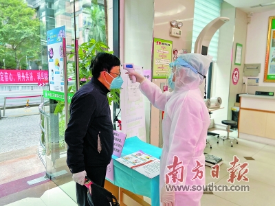 广州石牌街社区卫生服务中心工作人员为就诊人员测体温。郭苏莹 摄