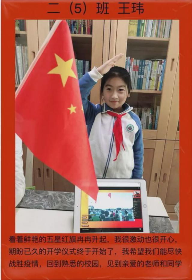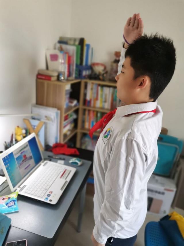 当天上午 9 点 -10 点,红桂小学还举行了网上开学典礼。同学们在家提前穿好了校服,戴好红领巾,并对着电脑中国旗升起的画面庄严行少先队队礼,与家长一起同唱国歌,庄严而隆重。"虽然同学们不能到校,但这种庄重的开学仪式感还是要有的。"叶育枢说。