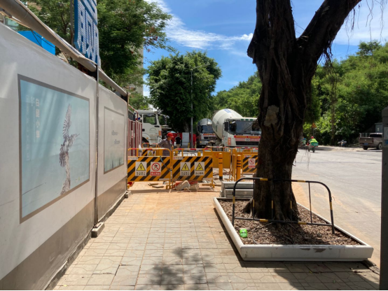 % @# P6 V/ h" |. P* s; I9 X2 z 经调查,南侧道路围挡施工范围均预留了人行通道引导行人绕行,图一电力施工区域为供电局施工范围。图二北侧道路原状为边坡底部,种植了一排榕树,并无人行道设计,目前根据施工图纸,施工单位将榕树外迁、树洞回填,后续将拓宽到1.2米改造为人行道。