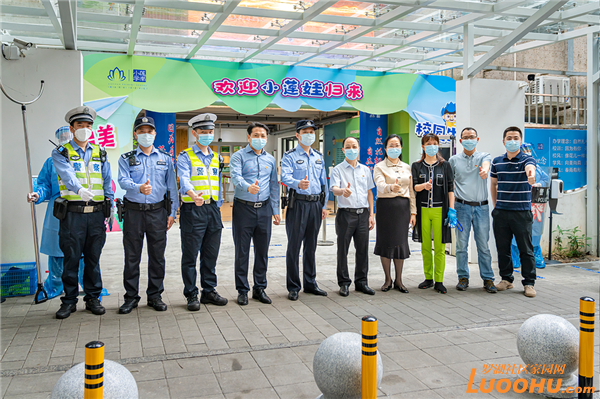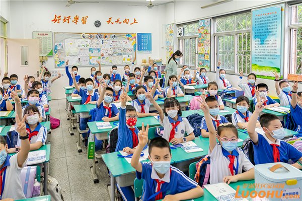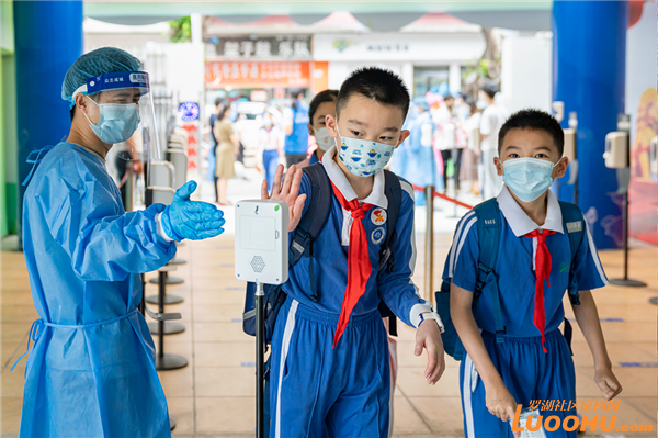 早上7点50开始,4-6年级学生分批、错峰进入学校。各班学生在提前规划好的地点排队、查验返校“四件套”资料、洗手测温,有序进入教室。校门口,师生见面互相亲切问候,憨萌可爱的吉祥物“莲莲”“南南”向同学们热情挥手,老师们手举特意制作的欢迎标语、班牌引导各班学生按防疫要求进入校园。