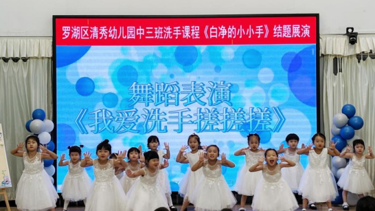 此次洗手课程结业展演由罗湖区清秀幼儿园的教师带领中三班的儿童及家长共同体验,在可爱的舞蹈表演“我爱洗手搓搓搓”之后,展演正式拉开序幕。
