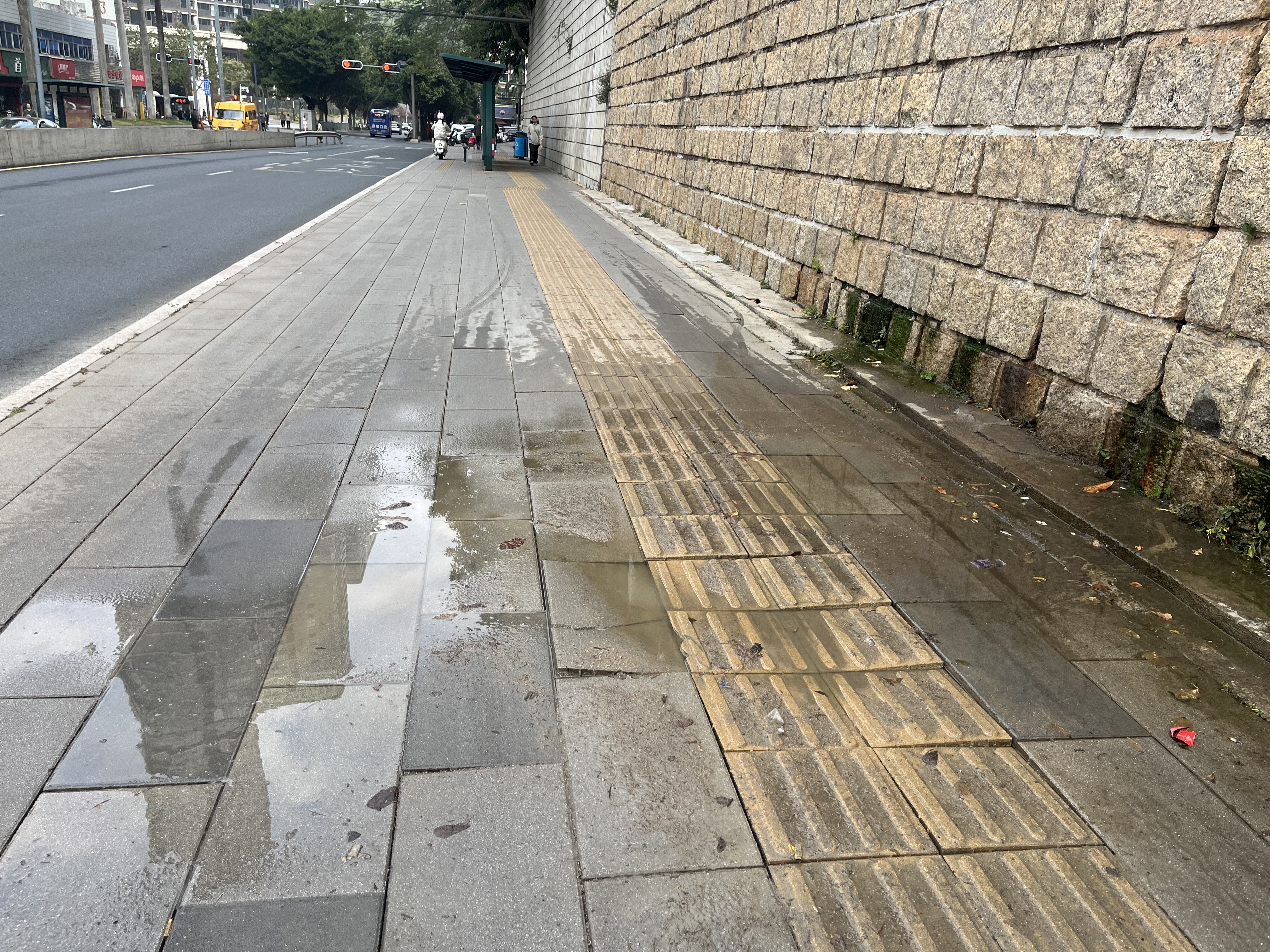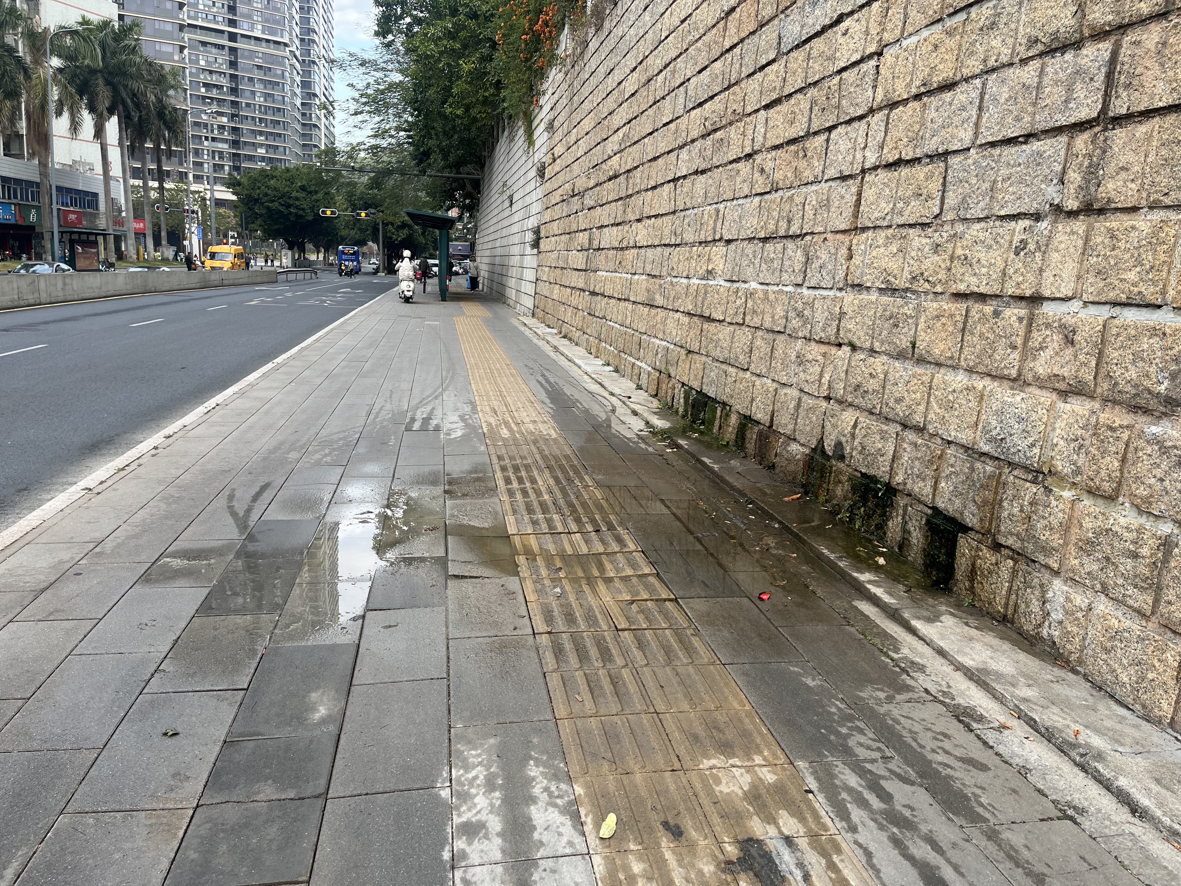 人行道上有几块地砖翘起,污水渗出,臭味很浓